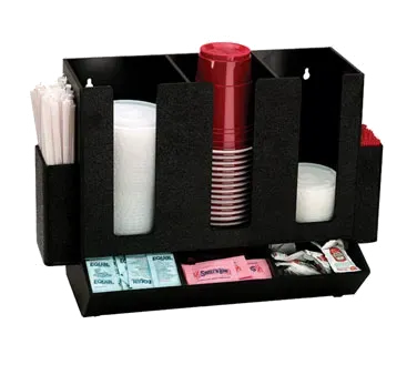 HLCO-3BT multi-purpose organizer features durable polystyrene construction. For use with cups, lids, straws, stir sticks and condiment packets. This unit can be mounted to a wall or surface or used as a countertop organizer.