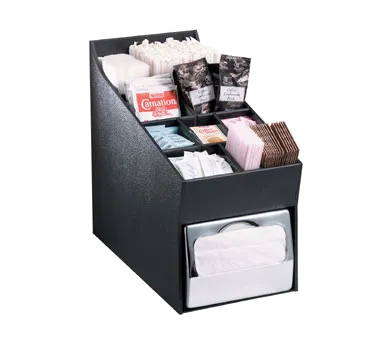 NLO Series countertop units feature durable polystyrene construction. These unique units offer maximum organization in a minimum amount of space. Organizers offer multiple sections for custom configuration. Includes a CT-FULL-BS full fold napkin dispenser that accommodates napkin sizes 4 1/2"-5" H x 6 1/2" W.