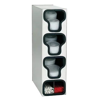 TLO Series countertop lid and straw organizers feature quality stainless steel with reinforced welded construction. Units include angled lid compartments and a divided section for standard and jumbo length straws or condiments. Available with two, three or four lid sections these cabinets occupy only 6 1/2" x 14" of countertop space. Maximum acceptable lid diameter is 4 3/4".