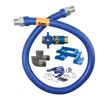 Take control like never before with Dormont Manufacturing's Gas Connector Hose Kit. This essential kit is designed to ensure safe appliance positioning in commercial restaurant settings. The kit includes a Dormont Blue Hose Moveable Gas Connector, measuring 1" inside diameter and 48" long. The hose is covered with a stainless steel braid and coated with blue antimicrobial PVC, providing durability and hygiene. The kit also includes a Safety Quik QDV for easy and secure connection, as well as two 90-degree elbows for flexible installation. With the included pair of Safety Set and hardware mounting options, you can confidently secure your appliances in place. Backed by a limited lifetime warranty, this Gas Connector Hose Kit from Dormont Manufacturing is a reliable and long-lasting solution for commercial restaurant owners. Ensure the safety and efficiency of your appliances with this top-quality kit.