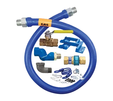 Streamline operations effortlessly with safe appliance positioning using the Dormont Manufacturing, 16100KITS48PS, Gas Connector Hose Kit. This kit is designed specifically for commercial restaurant use, ensuring the highest level of safety and efficiency. The 48" long hose is covered with a stainless steel braid and coated with blue antimicrobial PVC, providing durability and protection against bacteria growth. The kit includes a Snap Fast QD, Swivel MAX, full port valve, elbow, and a pair of Safety Set with hardware mounting options, offering flexibility and ease of installation. With a limited lifetime warranty, you can trust in the quality and reliability of this product. Whether you're setting up a new restaurant or upgrading your existing appliances, the Dormont Manufacturing Gas Connector Hose Kit is a must-have for any commercial kitchen.