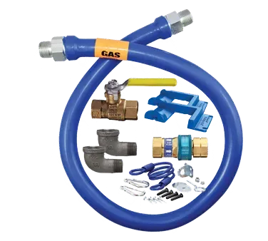 Revitalize dynamics with indispensable water access and use with the Dormont Manufacturing, 16125KIT48PS, Gas Connector Hose Kit. This kit is a must-have for commercial restaurants, providing a reliable and efficient solution for connecting gas appliances. The kit includes a 48" long hose, covered with a stainless steel braid and coated with blue antimicrobial PVC, ensuring durability and cleanliness. With the included SnapFast QD, full port valve, and 90-degree elbows, installation is a breeze. Safety is a top priority, and this kit comes with a pair of Safety Set with hardware mounting options, giving you peace of mind. The limited lifetime warranty further guarantees the quality and longevity of this product. Trust Dormont Manufacturing, a reputable vendor in the industry, to deliver a gas connector hose kit that meets the demands of a busy commercial restaurant. Upgrade your water access system today and experience the convenience and reliability this kit offers.