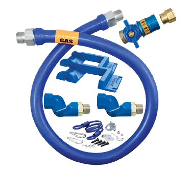 Streamline operations effortlessly with safe appliance positioning using the Dormont Manufacturing 1650KITCF2S48PS Gas Connector Hose Kit. This kit includes a 48" long, 1/2" inside diameter Dormont Blue Hose covered with a stainless steel braid and coated with blue antimicrobial PVC. The hose is designed to ensure safe and reliable gas connections, making it perfect for commercial restaurant use. The kit also includes a Safety Quik QDV for quick and secure disconnects, two Swivel MAX fittings for easy installation, and a pair of Safety Set with hardware mounting options for added stability. Additionally, the kit comes with a coiled restraining cable and hardware, providing an extra layer of safety. With a limited lifetime warranty, you can trust the quality and durability of this gas connector hose kit from Dormont Manufacturing. Upgrade your restaurant's gas connections today and enjoy peace of mind knowing your appliances are securely positioned.