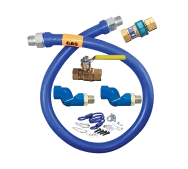 Optimize workspace dynamics with the Dormont Manufacturing Gas Connector Hose Kit. Designed specifically for commercial restaurant use, this state-of-the-art device ensures safe and efficient water access and use. The kit includes a 36" long, 3/4" inside diameter hose covered with a stainless steel braid and coated with blue antimicrobial PVC, providing durability and protection against bacteria growth. With a minimum flow capacity of 193,000 BTU/hr, this kit guarantees a reliable and consistent gas supply for high-demand restaurant equipment. The kit also features a SnapFast QD, two Swivel MAX connectors, a full port valve, and a SnapN Go for easy installation and maintenance. To ensure safety, a coiled restraining cable with hardware is included. Backed by a limited lifetime warranty, the Dormont Manufacturing Gas Connector Hose Kit is a must-have for any commercial restaurant looking to enhance productivity and safety.