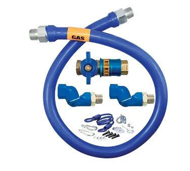 Transform elements with essential gas cooking and heating using the Dormont Manufacturing, 1675KITCF2S36 Gas Connector Hose Kit. This kit is designed to provide a reliable and safe connection for gas-powered appliances in commercial restaurant settings. The kit includes a 36" long hose covered with a stainless steel braid and coated with blue antimicrobial PVC, ensuring durability and cleanliness. It also comes with a Safety Quik QDV for easy and secure installation, as well as two Swivel MAX connectors for added flexibility. The coiled restraining cable with hardware ensures that the hose stays in place, preventing accidents and damage. With a minimum flow capacity of 193000 BTU/hr, this kit can handle the demands of high-powered gas appliances. Backed by a limited lifetime warranty, the Dormont Manufacturing, 1675KITCF2S36 Gas Connector Hose Kit is a reliable and essential tool for any commercial restaurant.