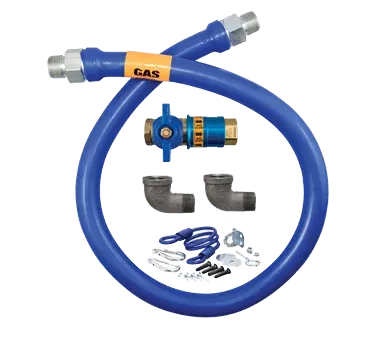Revolutionize your commercial restaurant with the Dormont Manufacturing Gas Connector Hose Kit. This game-changing kit is designed to provide safe and efficient gas connections, ensuring smooth operations in your kitchen. The kit includes a 36" long, 3/4" inside diameter hose covered with a stainless steel braid and coated with blue antimicrobial PVC. It also comes with a Safety Quik QDV, two 90-degree elbows, and a coiled restraining cable with hardware. With a minimum flow capacity of 124,000 to 218,000 BTU/hr, this kit is perfect for high-demand commercial kitchens. The hose is backed by a limited lifetime warranty, giving you peace of mind. Trust Dormont Manufacturing, a reputable vendor in the industry, to provide you with a reliable and durable gas connector hose kit. Upgrade your restaurant's gas connections today and experience the difference.