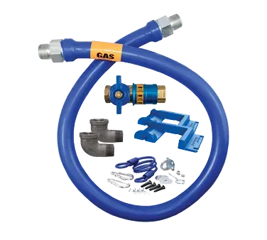 Ignite passion with an essential tool for gas cooking and heating. Introducing the Dormont Manufacturing 1675KITCF60PS Gas Connector Hose Kit, a must-have for commercial restaurant use. This kit includes a 60" long, 3/4" inside diameter Dormont Blue Hose, covered with a stainless steel braid and coated with blue antimicrobial PVC. The hose is designed to ensure safe and reliable gas connections, providing peace of mind in a busy kitchen environment. The kit also includes a Safety Quik QDV, two 90-degree elbows, and a pair of Safety Set with hardware mounting options, offering flexibility in installation. To further enhance safety, a coiled restraining cable with hardware is included. With a limited lifetime warranty, this kit is built to last and withstand the demands of a commercial kitchen. Trust Dormont Manufacturing for quality and reliability in gas connector hose kits. Upgrade your restaurant's gas connections today.