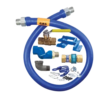 Streamline operations effortlessly with safe appliance positioning using the Dormont Manufacturing, 1675KITS60PS, Gas Connector Hose Kit. This kit is designed specifically for commercial restaurant use, ensuring the highest level of safety and efficiency. The 3/4" inside diameter, 60" long hose is covered with a stainless steel braid and coated with blue antimicrobial PVC, providing durability and protection against bacteria growth. The kit includes essential components such as the SnapFast QD, Swivel MAX, full port valve, elbow, SnapN Go, and a pair of Safety Set with hardware mounting options. With a limited lifetime warranty, you can trust in the quality and reliability of this product. Whether you're setting up a new restaurant or upgrading your existing appliances, the Dormont Manufacturing Gas Connector Hose Kit is a must-have for any commercial kitchen.