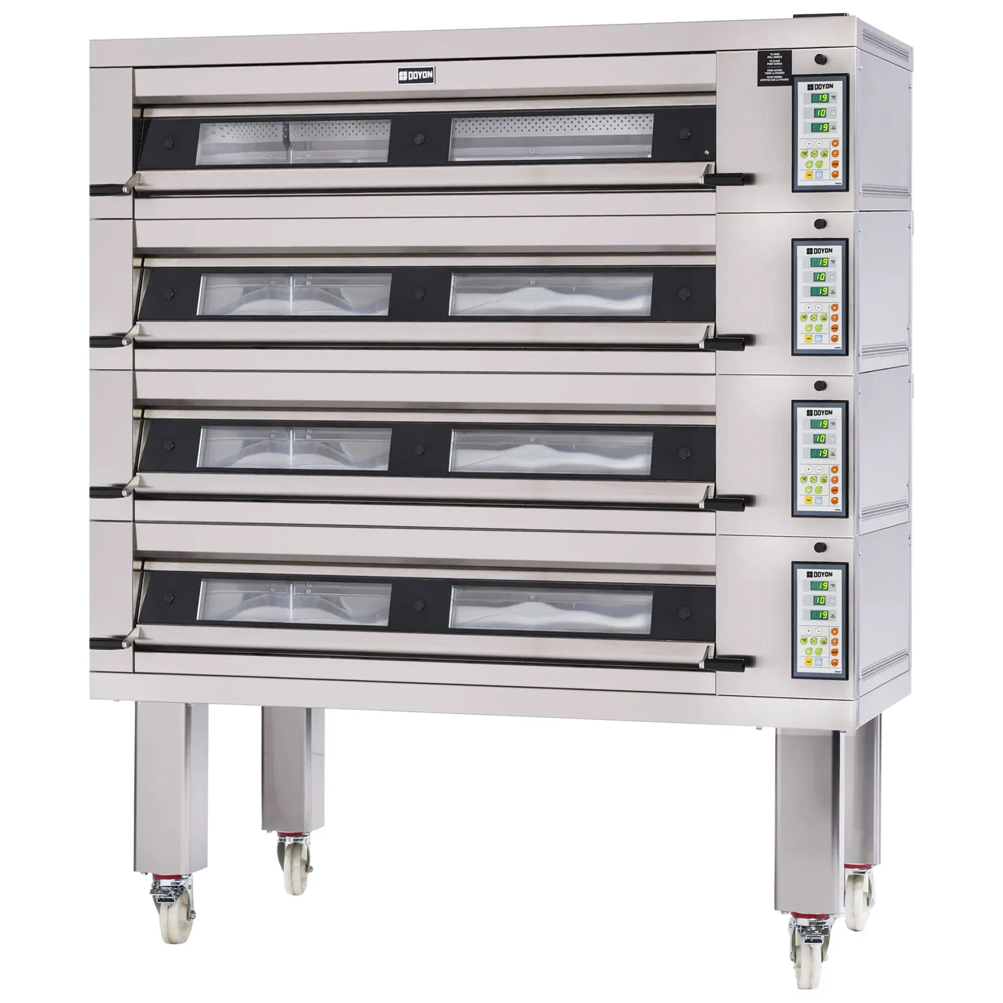 Infuse spaces with the magic of efficiency with the Doyon-Nuvu 3T-4 Electric Deck-Type Oven. Designed for commercial restaurant use, this artisan stone four deck oven is a game-changer in the kitchen. With a capacity of three pans per deck, you can bake a variety of delicious dishes simultaneously. The stone hearth bake deck ensures even heat distribution, resulting in perfectly cooked meals every time. The individual digital electronic temperature control allows you to precisely adjust the heat for each deck, giving you full control over your culinary creations. Plus, the self-contained steam injection per deck ensures moist and flavorful results. This oven also comes with a stand and oven cover for added convenience. ETL, cETLus, CE, and ISO certified, this Doyon-Nuvu oven guarantees top-notch quality and safety. Elevate your restaurant's efficiency and culinary prowess with the Doyon-Nuvu 3T-4 Electric Deck-Type Oven.