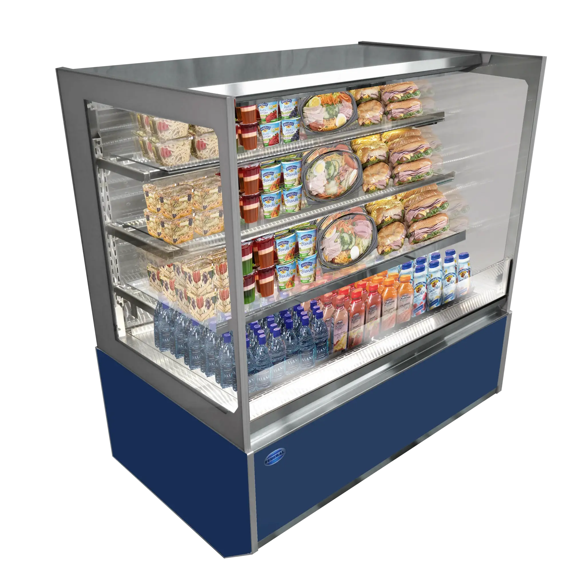 Discover the art of presentation with ease using the Federal Industries ITRSS4826-B18 Refrigerated Display Case. This floor-standing display case is designed specifically for commercial restaurant use, offering a stylish and functional solution for showcasing your culinary creations. With its Italian glass construction and adjustable glass shelves, you can create an eye-catching display that entices customers. The tempered glass ends and removable sliding rear glass doors provide easy access for arranging and restocking your products. The LED top light and shelf lights illuminate your items, ensuring they look their best at all times. The self-contained refrigeration system with a PTC condensate evaporator keeps your products fresh and at the perfect temperature. Made in the USA with a stainless steel interior and powder-coated steel base construction, this display case is built to last. Choose from six standard laminates on the base to match your restaurant's aesthetic. Elevate your presentation and attract customers with this high-quality refrigerated display case.