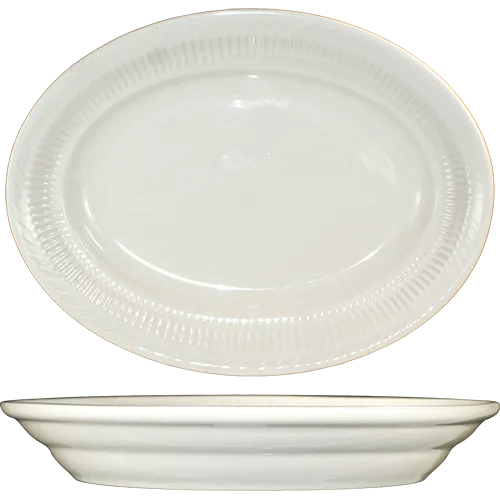 Maximize dining appeal effortlessly with the International Tableware AT-12 Platter. This oval-shaped platter, measuring 9-1/4" x 6-7/8", is designed to enhance the presentation of your culinary creations. The embossed, lined edge adds a touch of elegance, making it perfect for upscale restaurants and fine dining establishments. Crafted from lead-free ceramic, this platter is both microwave and dishwasher safe, ensuring convenience and durability in a busy commercial kitchen. The American White color and Athena design exude sophistication, complementing any table setting. Whether you're serving appetizers, main courses, or desserts, the International Tableware AT-12 Platter is a versatile and stylish choice that will impress your guests and elevate your restaurant's dining experience.