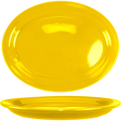 Enhance menus with stylish presentations using the International Tableware CAN-14-Y Platter. This oval-shaped platter measures 13-1/4" x 10-3/8" and features a narrow rim and rolled edge, adding a touch of elegance to any dish. Made from lead-free ceramic, this platter is both microwave and dishwasher safe, making it convenient for busy commercial restaurant kitchens. The vibrant yellow color of the Cancun collection adds a pop of color to your table settings, creating a visually appealing dining experience for your customers. Elevate your culinary creations with the International Tableware CAN-14-Y Platter.