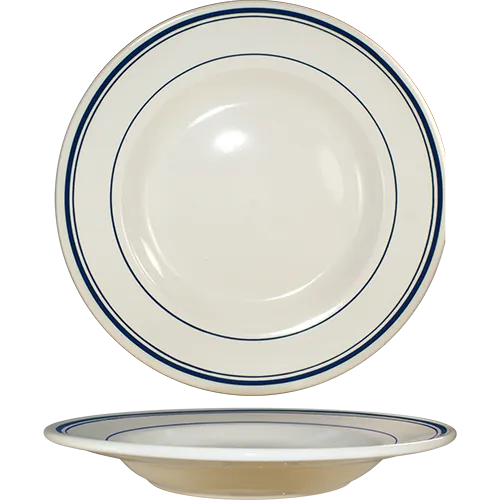 Set tables for memorable experiences with International Tableware's CT-105 China Bowl. This 16 oz. pasta bowl is perfect for commercial restaurant use, adding a touch of elegance to any dining setting. Crafted from lead-free ceramic, it ensures both durability and safety. The round shape and rolled edge design provide a classic and sophisticated look, while the American White color with a blue band adds a stylish touch. The CT-105 is microwave and dishwasher safe, making it convenient for busy restaurant kitchens. Its generous size and deep design make it ideal for serving pasta dishes, soups, salads, and more. Elevate your dining experience with the CT-105 China Bowl from International Tableware.