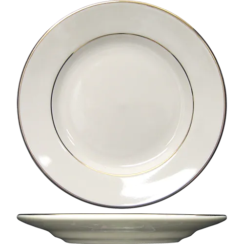 Boost functionality with chic designs using the International Tableware FL-8GF Plate. This round, 9" dia. plate is perfect for commercial restaurant use, adding a touch of elegance to any dining experience. The glazed footed design not only enhances the plate's visual appeal but also provides stability and durability, making it dishwasher safe and lead-free. Crafted from high-quality ceramic, this plate is designed to withstand the rigors of a busy restaurant environment. The American White color with a gold band adds a sophisticated touch to any table setting, making it ideal for upscale establishments.