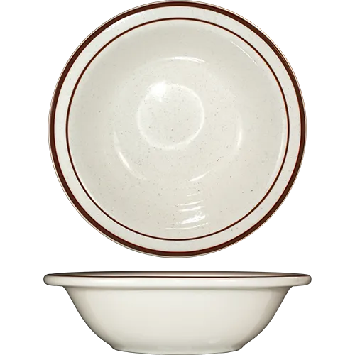 Premium tableware for culinary excellence with International Tableware, GR-10, China, Bowl, 9 - 16 oz. Elevate your restaurant's dining experience with these exquisite grapefruit bowls. Crafted with care, these 14 oz. bowls are perfect for serving a variety of dishes, from refreshing fruit salads to delectable desserts. The narrow rim design adds a touch of elegance, while the American White color with Brown speckle and rim brings a rustic charm to your table setting. Made from lead-free ceramic, these bowls are both microwave and dishwasher safe, ensuring convenience and durability. The Granada pattern adds a unique flair to your presentation, making these bowls a standout choice for any commercial restaurant. Trust International Tableware for exceptional quality and style.
