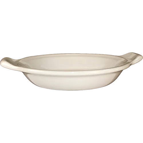 Seamless tableware solutions with International Tableware, SEGG-65, Au Gratin Dish, China. This shirred egg dish is a must-have for any commercial restaurant. With a capacity of 9-1/2 oz., it is perfect for serving individual portions of delectable au gratin dishes. The round shape and convenient handles make it easy to carry and serve. Made of lead-free stoneware-ceramic, this dish is not only durable but also oven, microwave, and dishwasher safe, ensuring hassle-free cooking and cleaning. Its American White color adds a touch of elegance to any table setting. Whether you're serving classic French cuisine or experimenting with new recipes, this au gratin dish is a versatile and reliable choice. Elevate your culinary creations with International Tableware's SEGG-65 Au Gratin Dish.