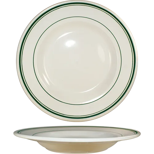 Set offerings apart with tableware innovation using the International Tableware VE-105 China Bowl. This versatile pasta bowl is perfect for commercial restaurant use, with a generous 16 oz. capacity and a diameter of 10-7/8". Crafted from durable ceramic, it features a rolled edge for added strength and a stylish American White design with a green band, adding a touch of elegance to any table setting. The VE-105 bowl is both microwave and dishwasher safe, making it convenient for busy restaurant kitchens. With its lead-free construction, this bowl ensures the safety of your customers. Whether you're serving pasta, salads, or other delicious dishes, the International Tableware VE-105 China Bowl is a reliable and attractive choice that will enhance the dining experience in your restaurant.