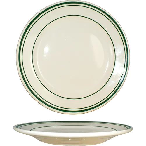 Stay competitive with appealing settings using the International Tableware VE-7 Plate. This ceramic plate is designed for commercial restaurant use, ensuring durability and functionality. With a 7-1/8" diameter and a rolled edge, it provides a classic and elegant presentation for your culinary creations. The microwave and dishwasher-safe feature allows for easy heating and cleaning, saving you time and effort. The lead-free construction ensures the safety of your customers and staff. The American White color with a green band adds a touch of sophistication to any table setting. Trust International Tableware, a reputable vendor in the industry, to deliver high-quality products that enhance your dining experience. Elevate your restaurant's ambiance and impress your guests with the International Tableware VE-7 Plate.