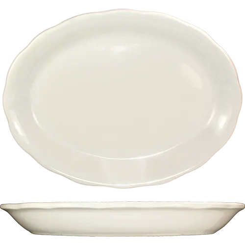 Precision in tableware elegance with International Tableware, VI-14, Platter, China. This oval platter is the epitome of sophistication, designed to elevate the dining experience in commercial restaurants. Crafted with a scalloped edge and made from lead-free ceramic, this platter exudes timeless charm while ensuring durability and safety. Its generous size of 12-3/4" x 9-1/4" provides ample space for presenting culinary creations with flair. The microwave and dishwasher-safe feature allows for convenient heating and effortless cleaning, saving valuable time in a bustling restaurant environment. The American White color adds a touch of elegance to any table setting, while the Victoria design adds a subtle touch of refinement. Whether serving appetizers, main courses, or desserts, this platter is a versatile and essential addition to any commercial restaurant's tableware collection. Trust International Tableware for exceptional quality and style that impresses both diners and staff alike.