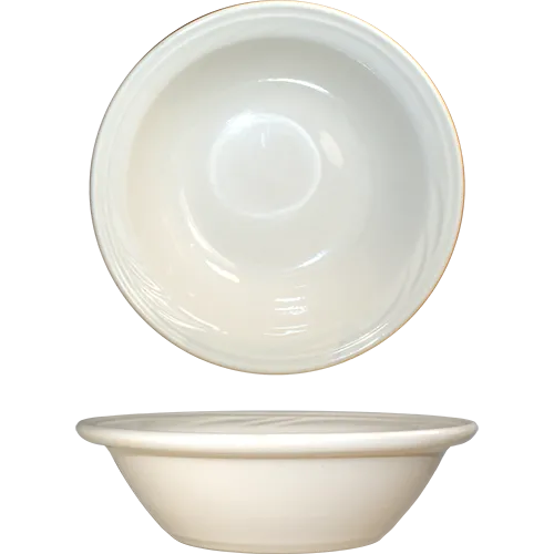 Upgrade tableware with chic products using the International Tableware Y-10 China Bowl. This grapefruit bowl is perfect for commercial restaurant use, with a capacity of 11 oz. and a diameter of 6-3/8". The round shape and embossed design add a touch of elegance to any table setting. The rolled edge ensures durability and prevents chipping, while the highly polished foot adds a sophisticated finish. Made of lead-free ceramic, this bowl is both microwave and dishwasher safe, making it convenient for busy restaurant kitchens. The American White color adds a classic touch, while the York pattern adds a subtle charm. Elevate your restaurant's dining experience with the International Tableware Y-10 China Bowl.