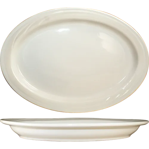 Stay competitive with appealing settings using the International Tableware Y-12 Platter. This oval-shaped platter, measuring 10-1/2" x 7-3/8", is perfect for showcasing your culinary creations in a commercial restaurant setting. The embossed design and rolled edge add a touch of elegance, while the highly polished foot ensures stability on any surface. Made from lead-free ceramic, this platter is both microwave and dishwasher safe, making it convenient for busy restaurant kitchens. The American White color adds a classic and timeless look to your table settings, while the York pattern adds a subtle charm. Elevate your presentation and impress your guests with the International Tableware Y-12 Platter, designed to enhance the dining experience in your commercial restaurant.