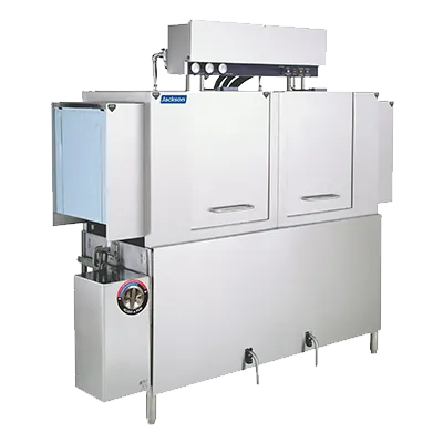 Upgrade standards with modern approaches using the Jackson WWS, AJ-64CE Dishwasher, Conveyor Type. This high-performance dishwasher is designed to meet the demands of a busy commercial restaurant. With an adjustable conveyor speed and a high temperature sanitizing rinse, it can handle approximately 287 racks per hour, ensuring efficient and thorough cleaning. The two-tank design, with separate wash and rinse tanks, ensures optimal cleanliness. The stainless steel construction not only adds durability but also makes it easy to clean and maintain. With a clearance of 25 inches, it can accommodate even the tallest dishes and utensils. The electric tank heat and vent fan control provide precise temperature control and efficient drying. Certified by cETLus and NSF, this dishwasher meets the highest industry standards. Upgrade your restaurant's dishwashing capabilities with the Jackson WWS, AJ-64CE Dishwasher, Conveyor Type.