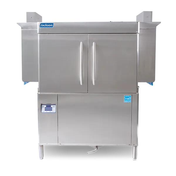 Equip your kitchen with innovative solutions using the Jackson WWS, RACKSTAR 44CEL Dishwasher, Conveyor Type. This high-capacity dishwasher is designed for commercial restaurant use, offering a convenient and efficient way to clean dishes. With a capacity of approximately 223 racks per hour, this dishwasher can handle the demands of a busy kitchen. The low temperature chemical sanitizing with electric tank heat ensures that dishes are thoroughly cleaned and sanitized. The fully automatic operation, including auto-fill and digital temperature readout, makes it easy to use and monitor. The double-wall insulated doors on the front and EnergyGuard controls help to conserve energy and reduce operating costs. The Dual Rainbow Rinse feature allows you to choose between Econo or Turbo settings, depending on your needs. Made with stainless steel construction and adjustable bullet feet, this dishwasher is built to last and can be easily customized to fit your space. Trust the Jackson WWS RACKSTAR 44CEL Dishwasher to deliver exceptional performance and reliability in your commercial restaurant.