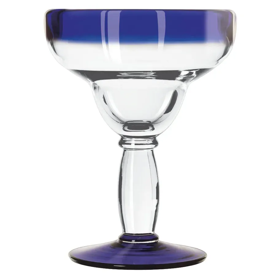 Stay competitive with cutting-edge options using the Libbey Glass, 92308, Glass, Margarita. This hand-blown margarita glass is designed to elevate your restaurant's drink presentation. With a capacity of 12 oz., it is perfect for serving refreshing margaritas to your customers. The cobalt blue rim and foot add a touch of elegance and style to any table setting, making it ideal for upscale establishments. The anneal treated glass ensures durability and longevity, even with frequent use in a busy restaurant environment. This glass is dishwasher and microwave safe, allowing for easy cleaning and reheating of beverages. The Libbey Glass, 92308, Glass, Margarita measures H 6-3/8" T 4-5/8" B 3-1/2" D 4-5/8", providing ample space for garnishes and ice. Enhance your drink service and impress your customers with this high-quality margarita glass.