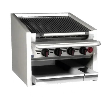Deliver food perfection with the Magikitchn CM-RMB-660CR Gas Countertop Charbroiler. This top-of-the-line charbroiler is designed to meet the demands of a busy commercial restaurant kitchen. With a 60" wide cooking surface and a free-floating round rod top grate, you can easily cook a large volume of food at once. The EZ tilt to front grease trough ensures that excess grease is efficiently drained away, keeping your food healthier and reducing the risk of flare-ups. The cast iron radiants provide even heat distribution, ensuring that your food is cooked to perfection every time. Made with 95% stainless steel, this charbroiler is built to withstand the rigors of a commercial kitchen. It also features a 6" service shelf with a utility bar, allowing you to keep your cooking utensils within easy reach. With its water tubs and top grid scraper, cleaning up after cooking is a breeze. Upgrade your restaurant kitchen with the Magikitchn CM-RMB-660CR Gas Countertop Charbroiler and experience the difference in taste and efficiency.