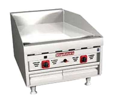 Master your restaurant's kitchen with the Magikitchn MKG-24 Gas Countertop Griddle. This high-quality griddle is designed to meet the demands of a busy commercial kitchen. With a 23-3/4" wide by 24" deep cooking surface, you'll have plenty of space to cook multiple items at once. The 1" thick polished griddle plate ensures even heat distribution for consistent cooking results. The snap-action thermostat and piezo ignitor make it easy to control and ignite the griddle, while the grease chute and box, along with the front grease trough, help to keep your kitchen clean and organized. The 3" side splash provides added safety, and the stainless steel construction ensures durability and easy cleaning. With 60,000 BTUs of power, this griddle is ready to handle any cooking task. Trust Magikitchn to deliver reliable and efficient equipment for your restaurant.