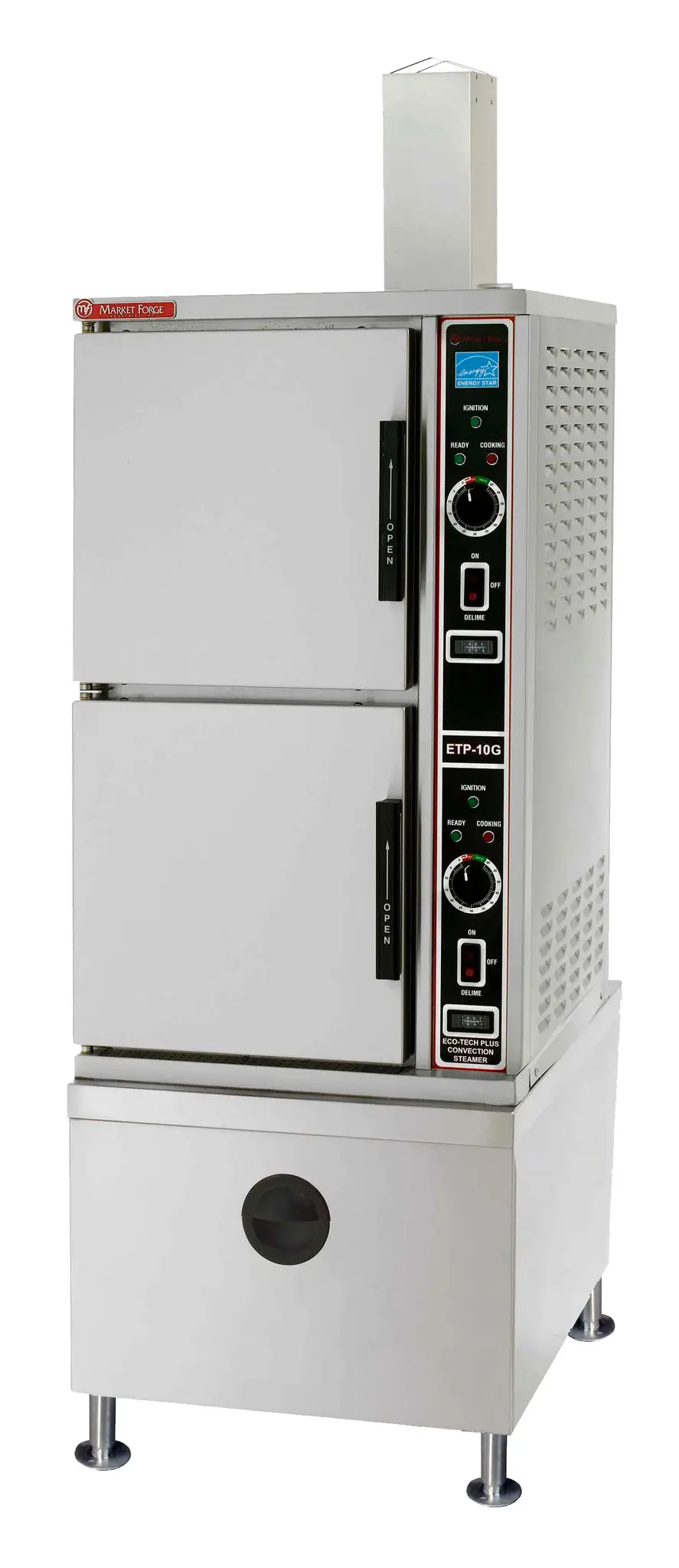 Elevate culinary excellence effortlessly with the Market Forge ETP-10G Convection Steamer. This floor model gas steamer is designed for commercial restaurant use, making it the perfect addition to any professional kitchen. With two compartments and a capacity for five 12" x 20" x 2-1/2" pans, this steamer allows for efficient cooking of large quantities of food. The ECO-TECH PLUS technology ensures energy efficiency, while the self-contained water filter and automatic water fill make operation a breeze. Each compartment is individually controlled by a power switch and features a 60-minute timer for precise cooking. The stainless steel interior and exterior guarantee durability and easy cleaning. With 84,000 BTU and ENERGY STAR certification, this steamer delivers powerful performance while reducing energy consumption. Trust Market Forge, a renowned vendor in the industry, and enhance your restaurant's productivity and efficiency with the ETP-10G Convection Steamer.