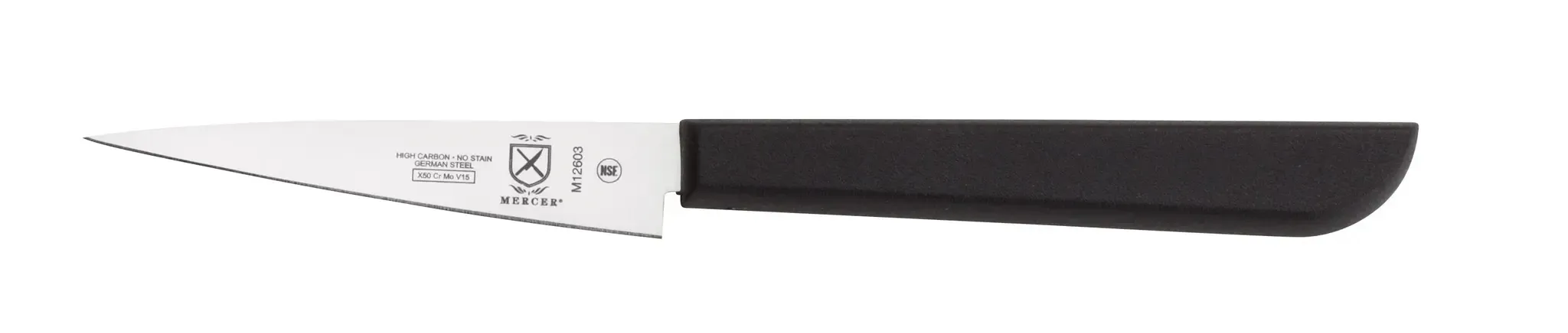 Enhance culinary precision with the Mercer Culinary, M12603 Carving Knife. This Japanese-style knife is a must-have tool for any commercial restaurant. With its sharp blade point and semi-flexible high-carbon German steel blade, this knife effortlessly slices through meats, ensuring clean and precise cuts every time. The textured polypropylene handle provides a comfortable grip, allowing for optimal control and maneuverability. Whether you're carving a roast or slicing delicate cuts of fish, this knife is designed to meet the demands of a busy kitchen. The NSF certification guarantees the knife's safety and hygiene, making it suitable for professional use. Elevate your culinary skills and deliver exceptional dishes with the Mercer Culinary, M12603 Carving Knife.