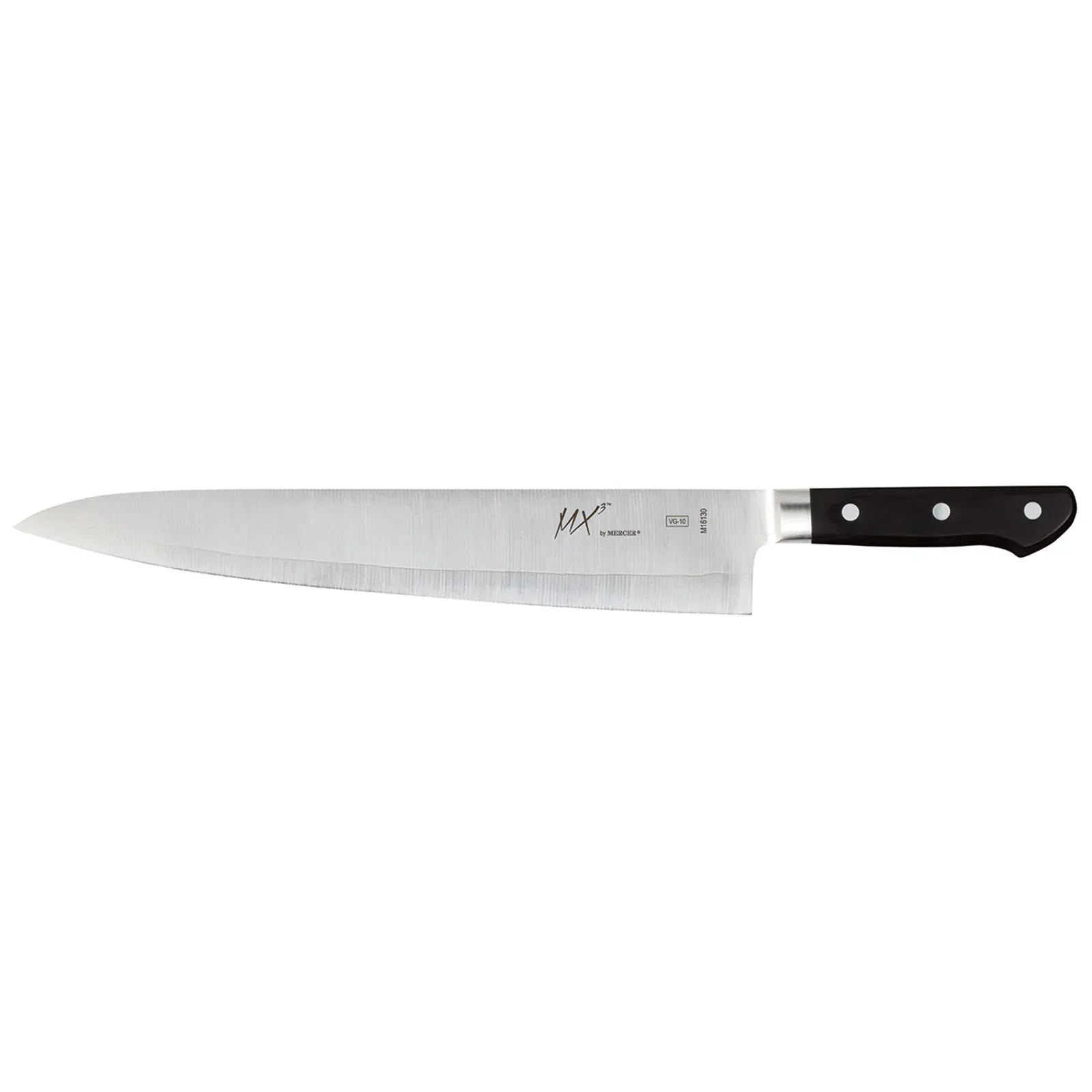 Optimize kitchen workflow with the Mercer Culinary, M16130, Knife, Asian. This 300mm (11.8") Gyuto knife is a must-have tool for any commercial restaurant. With its one-piece, full tang construction and forged 3-layer Japanese VG-10 super-steel core blade, this knife offers exceptional durability and precision. The taper-ground edge ensures effortless slicing and dicing, while the triple riveted ergonomic Delrin handle provides a comfortable grip for extended use. Whether you're preparing sushi, sashimi, or other Asian-inspired dishes, this knife delivers exceptional performance and reliability. Its authentic Japanese craftsmanship and high-quality materials make it a valuable addition to any professional kitchen. Streamline your kitchen operations and elevate your culinary creations with this top-of-the-line Asian knife.
