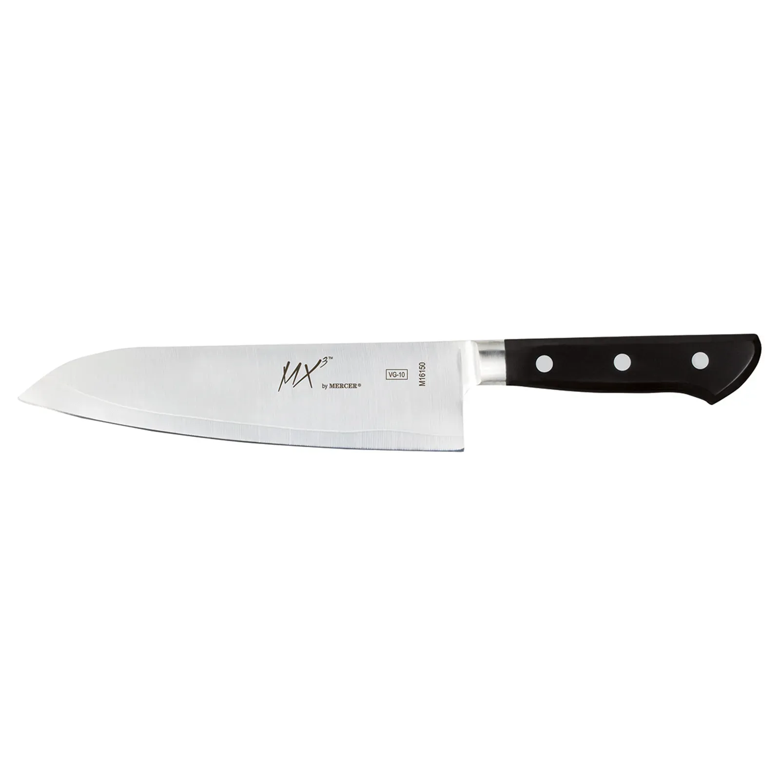 Optimize kitchen efficiency with the Mercer Culinary, M16150, Knife, Asian. This 185mm (7") Santoku knife is a must-have tool for any commercial restaurant. Its one-piece, full tang construction ensures durability and stability, while the forged 3-layer Japanese VG-10 super-steel core blade delivers exceptional sharpness and edge retention. The taper-ground edge allows for precise slicing, dicing, and chopping, making it perfect for preparing a wide range of ingredients. The triple riveted ergonomic Delrin handle provides a comfortable grip, reducing fatigue during extended use. Whether you're a professional chef or a culinary enthusiast, this knife will enhance your culinary skills and streamline your food preparation process. With its high-quality craftsmanship and authentic Japanese design, the Mercer Culinary, M16150, Knife, Asian is a reliable and versatile tool that will elevate your restaurant's efficiency and performance.