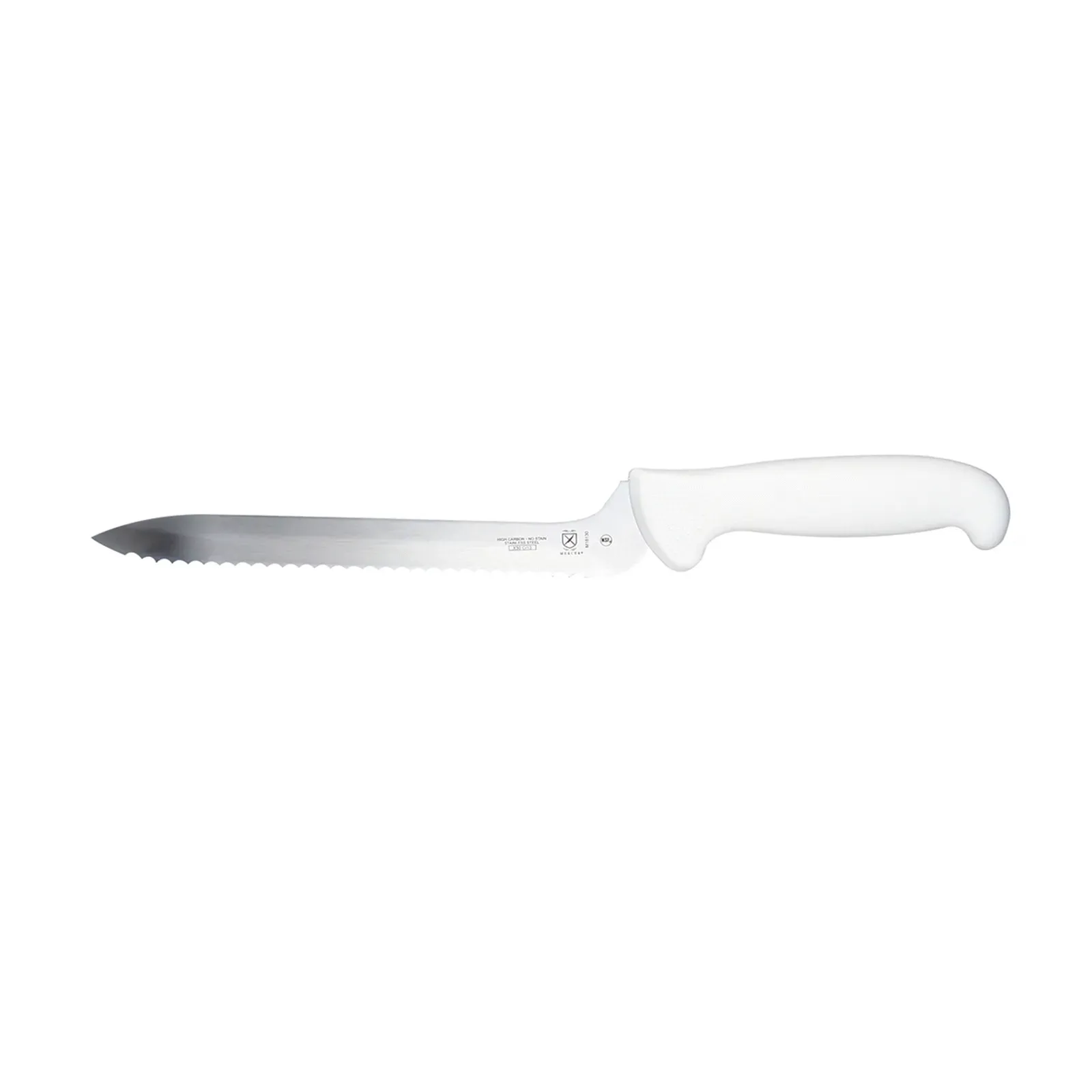Elevate kitchen operations with the Mercer Culinary, M18130, Knife, Utility. This 8" Offset Bread knife is designed to enhance efficiency and precision in a commercial restaurant setting. The wavy edge allows for effortless slicing through crusty bread, ensuring consistent and clean cuts every time. Made with high carbon, stain-resistant steel, this knife offers exceptional durability and longevity, even with heavy use. The ergonomic white handle features textured finger points and a protective finger guard, providing a comfortable and secure grip to prevent accidents. NSF certified, this knife meets the highest standards of safety and sanitation. Trust Mercer Culinary for professional-grade tools that deliver exceptional performance and value.