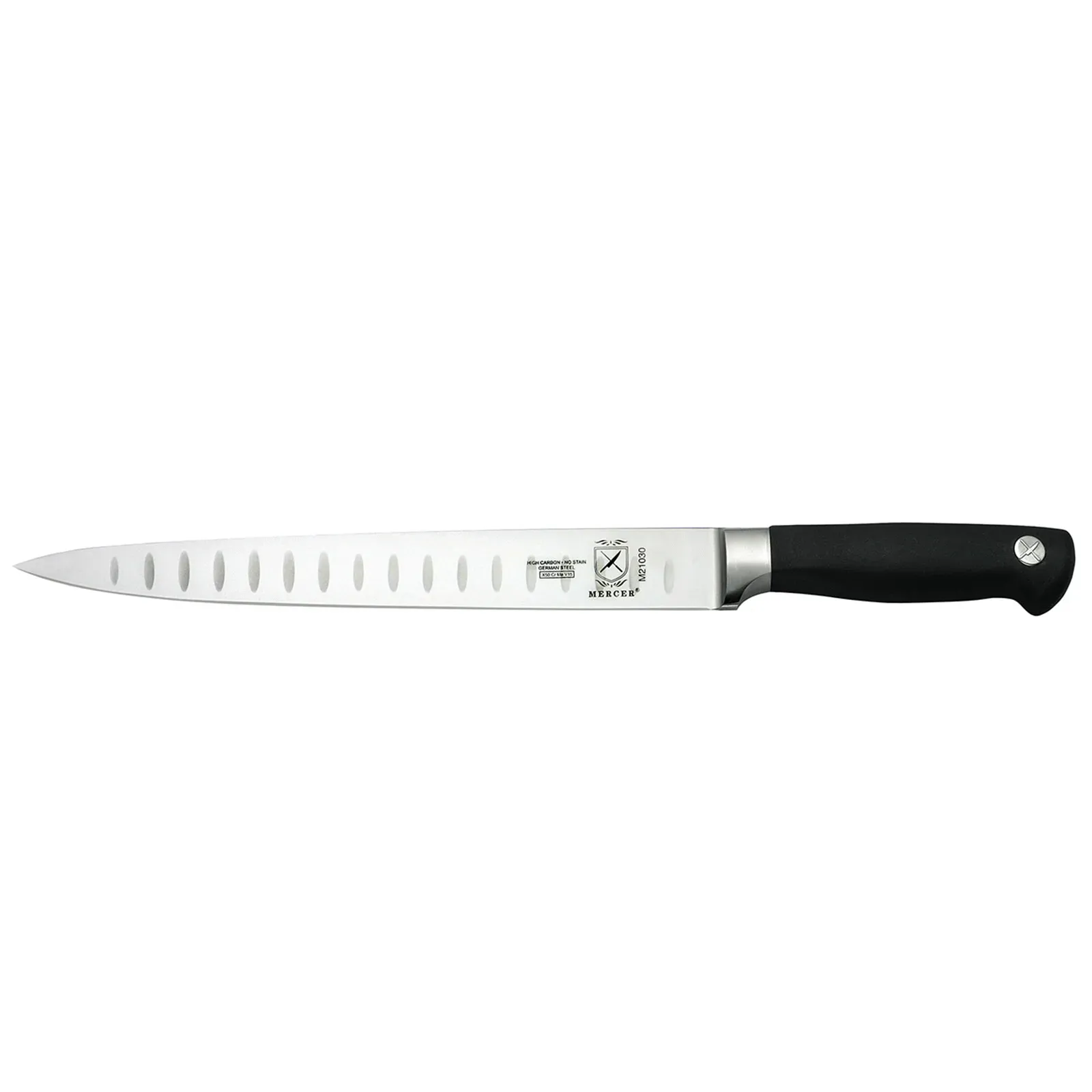 Upgrade culinary efficiency with the Mercer Culinary, M21030 Carving Knife. This 10" knife is designed for commercial restaurant use, making it the perfect tool for slicing and carving meats with precision. The granton edge reduces friction and prevents food from sticking to the blade, ensuring smooth and effortless cuts every time. Crafted from high carbon, no-stain German steel, this knife is built to withstand the demands of a busy kitchen. The black non-slip Santoprene handle provides a secure grip, even when wet, allowing for safe and comfortable handling. NSF certified, this knife meets the highest standards of safety and sanitation.