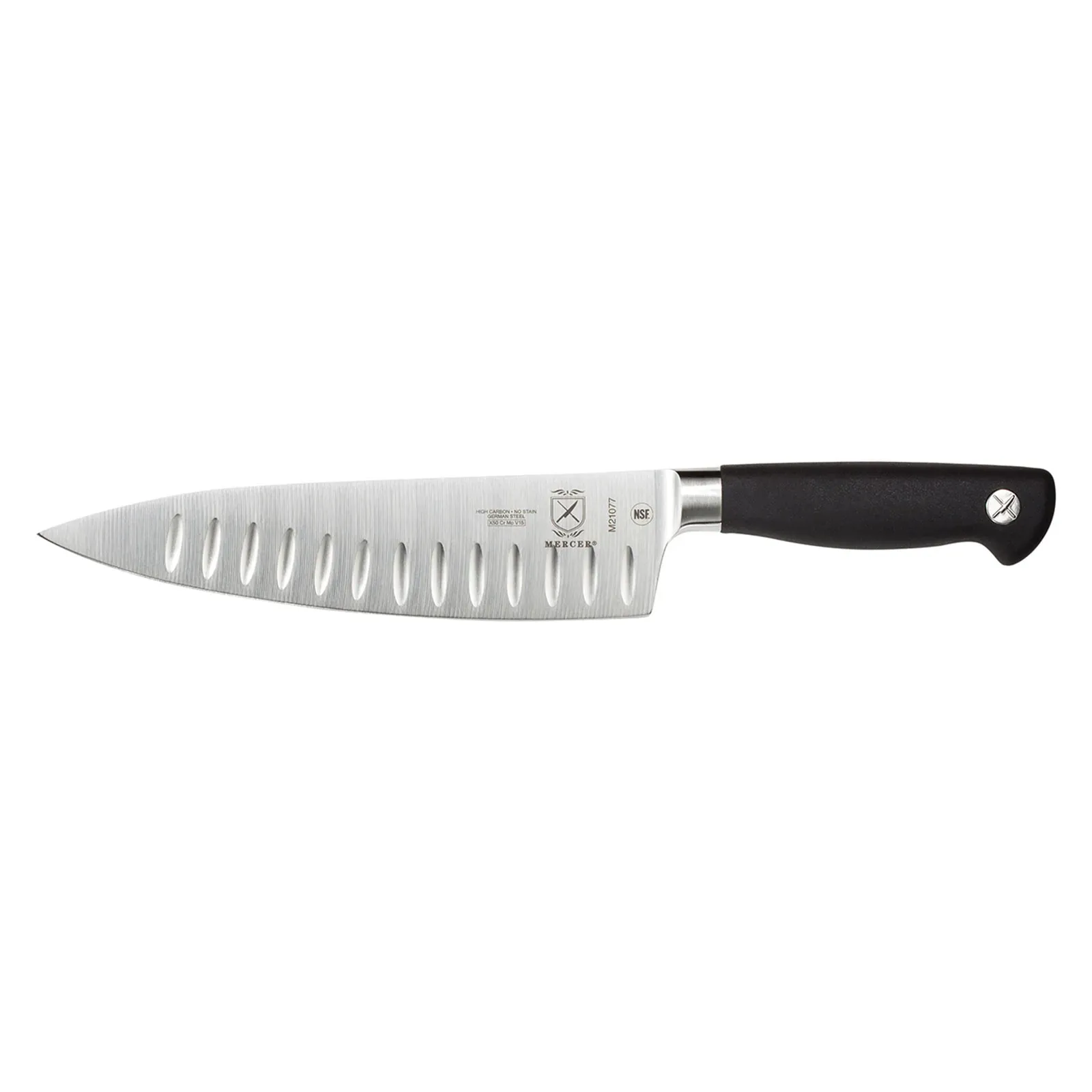 Equip your kitchen for success with the Mercer Culinary, M21077 Chef's Knife. This 8" knife is designed with a Granton edge and a short bolster, making it perfect for commercial restaurant use. The precision-forged, high carbon, no-stain German steel blade ensures exceptional durability and long-lasting performance. The black non-slip Santoprene handle provides a comfortable and secure grip, even in busy kitchen environments. NSF certified, this knife meets the highest standards of safety and sanitation. Whether you're slicing, dicing, or chopping, the Mercer Culinary Chef's Knife delivers unparalleled precision and control. Invest in this top-quality knife and elevate your culinary creations to new heights. Trust Mercer Culinary for all your kitchen needs.