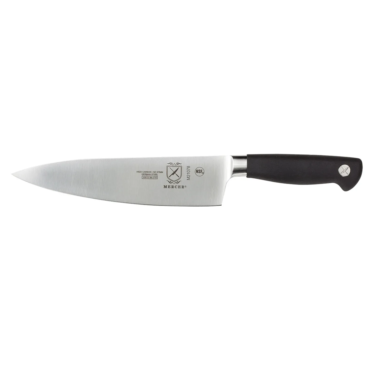 Boost kitchen experiences with the Mercer Culinary, M21078, Knife, Chef. This 8" chef's knife is designed to excel in commercial restaurant settings, delivering precision and durability. Crafted with high carbon German steel, the knife is precision forged for exceptional sharpness and edge retention. The short bolster design allows for easy handling and maneuverability, making it ideal for intricate tasks like chopping, slicing, and dicing. The black non-slip Santoprene handle ensures a secure grip, even when wet, reducing the risk of accidents in a fast-paced kitchen environment. NSF certified, this knife meets the highest standards of safety and sanitation. Elevate your culinary creations with the Mercer Culinary, M21078, Knife, Chef.