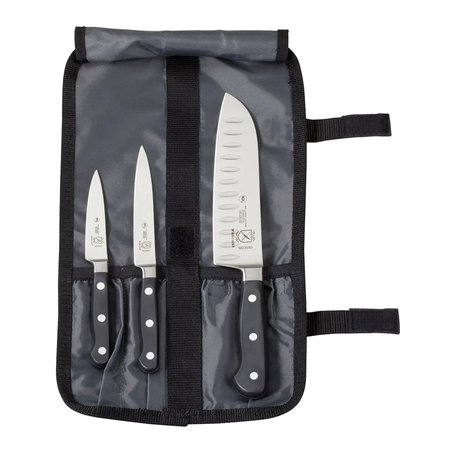 Elevate culinary experiences with the Mercer Culinary, M21950, Knife Set. This 4-piece starter set is perfect for commercial restaurant use. It includes a 3-1/2" paring knife, a 5" utility knife, and a 7" santoku, all made with high-carbon no stain German steel blades. These blades are not only durable but also resistant to abrasions, tears, and scuffs, ensuring long-lasting performance in a busy kitchen. The knives feature ergonomic Delrin handles, providing a comfortable grip for precise cutting and chopping. The set comes with a knife storage roll, made with a heavy-duty 600 Denier lightweight poly/canvas exterior, offering excellent protection and easy transportation. With a limited lifetime warranty, this Mercer Culinary knife set is a reliable choice for professional chefs and restaurant owners. Upgrade your kitchen tools and enhance your culinary creations with this exceptional knife set.