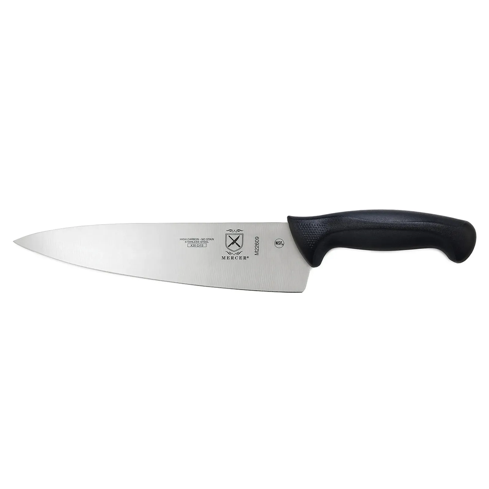 Enhance culinary precision with the Mercer Culinary, M22609 Chef's Knife. This 9" knife is a must-have tool for any commercial restaurant. Crafted with high carbon, Japanese stain-resistant steel, it ensures durability and long-lasting performance. The black non-slip Santoprene and polypropylene handle provides a comfortable grip, even in busy kitchen environments. With textured finger points and a protective finger guard, this knife offers added safety during use. The NSF certification guarantees its quality and suitability for professional use. Whether you're slicing, dicing, or chopping, this Millennia Chef's Knife delivers exceptional precision and control. The 9" stamped blade allows for effortless cutting through a variety of ingredients, making it an essential tool for chefs and cooks alike. Elevate your culinary skills with the Mercer Culinary, M22609 Chef's Knife.