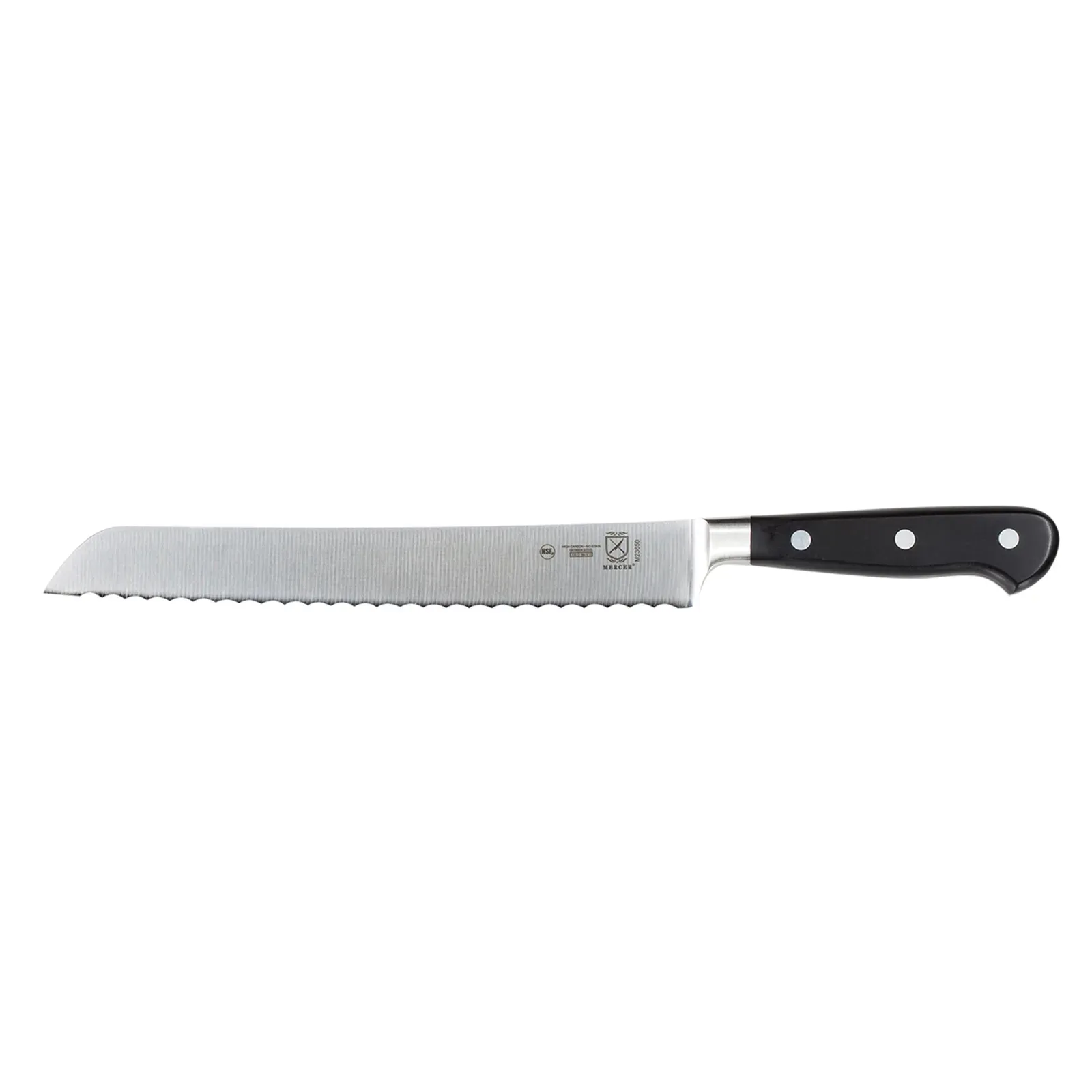 Upgrade culinary efficiency with the Mercer Culinary, M23650 Knife, Bread / Sandwich. This 9" Bread knife is designed to enhance your restaurant's bread and sandwich preparation. Its wavy edge allows for precise slicing, ensuring consistent thickness and minimal tearing. Crafted from high carbon, no-stain German steel, this knife offers exceptional durability and resistance to corrosion, making it perfect for the demands of a commercial kitchen. The one-piece precision forged construction and triple riveted handle provide superior strength and stability, allowing for comfortable and controlled handling. The ergonomic Delrin handle further enhances grip and reduces fatigue during extended use. NSF certified, this knife meets the highest standards of safety and sanitation.