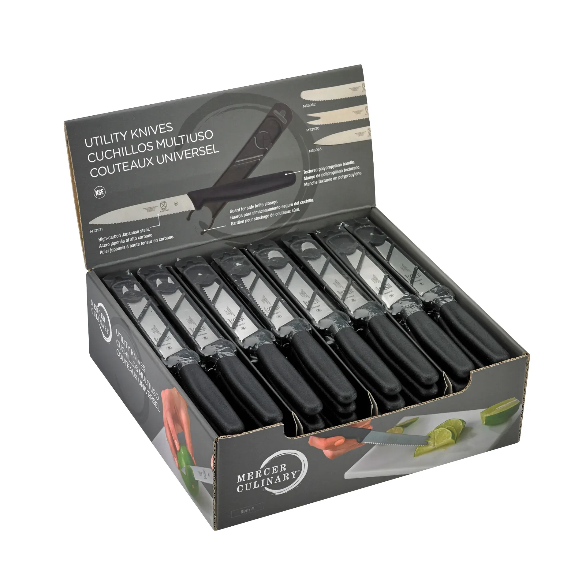 Elevate kitchen operations with the Mercer Culinary, M33935, Knife Set. This utility/fruit knife set is designed to meet the demands of a commercial restaurant setting. The set includes four different knives, each with its own unique features. The 4-1/4" fruit/utility knife with a wavy edge is perfect for slicing through fruits and vegetables with ease. The 4" bar/utility knife with a pointed tip and wavy edge is ideal for precise cutting tasks. The 4" bar/utility knife with a pointed tip and plain edge offers versatility for various cutting needs. Lastly, the 4-1/3" bar/utility knife with a rounded tip and wavy edge provides added safety and control. Made with Japanese steel and featuring a textured black polypropylene handle, these knives are durable and comfortable to use. The set also includes slide-on knife guards for safe storage. Elevate your culinary creations with the Mercer Culinary, M33935, Knife Set.