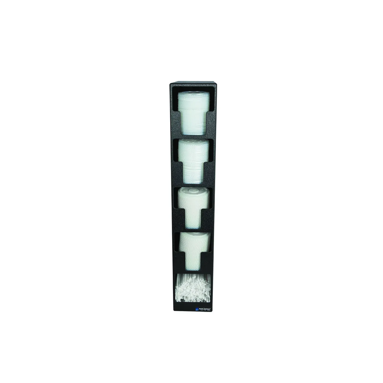 Simplify processes with the San Jamar L2204 Lid Dispenser. Designed for commercial restaurant use, this countertop dispenser is a must-have for any busy establishment. With its EZ-Fit Lid & Straw Tower, this dispenser offers convenience and organization in one compact unit. Measuring 5-1/2"L x 13"W x 30"H, it contains four lid compartments and one straw compartment, allowing for easy access and quick service. Made of durable polystyrene in a sleek black color, this dispenser is not only functional but also NSF certified for food safety. Streamline your operations and keep your restaurant running smoothly with this reliable and efficient lid dispenser.