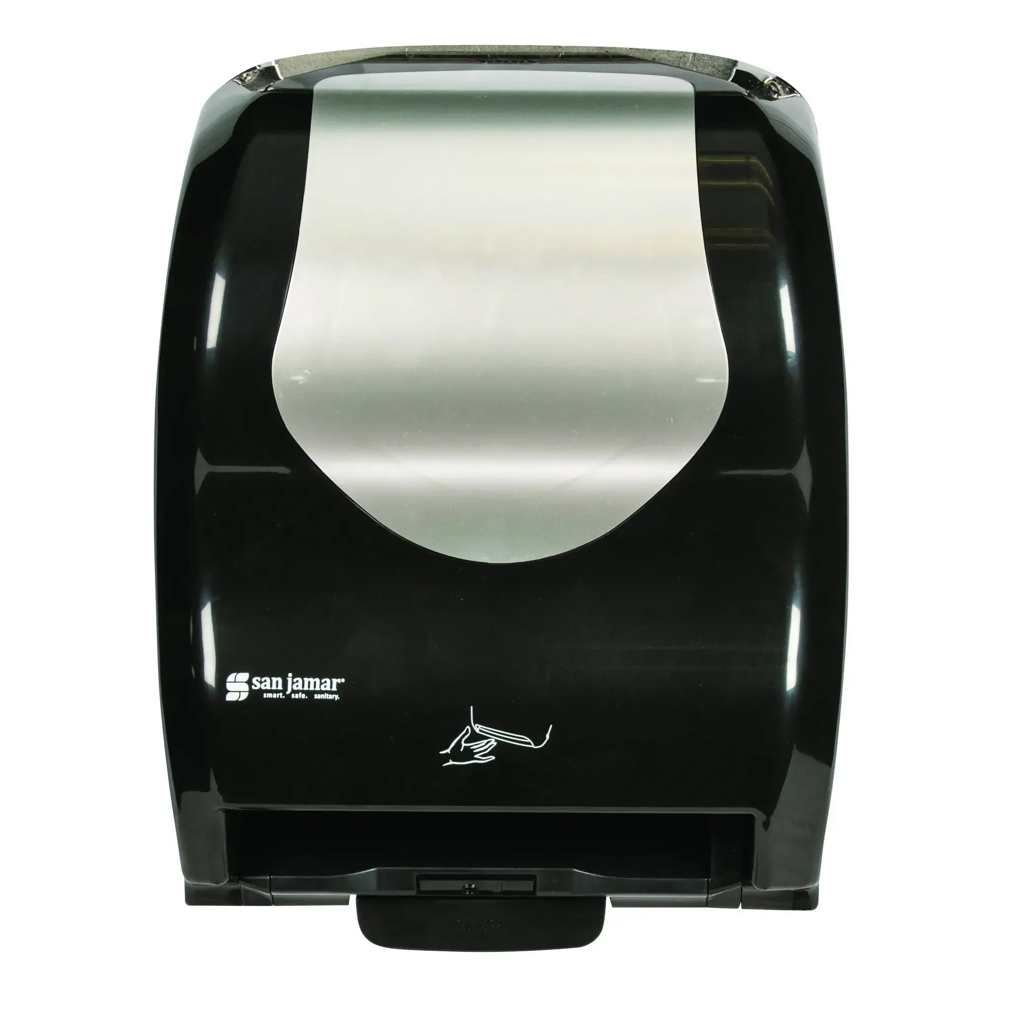 Ensure reliability with the San Jamar T8370BKSS Paper Towel Dispenser. Designed for commercial restaurant use, this dispenser combines convenience and efficiency to meet your establishment's needs. With its sleek black and stainless steel look, it adds a touch of sophistication to any restroom or kitchen area. The dispenser holds one 8" wide roll of paper towels and features a touchless operation, ensuring optimal hygiene for your customers and staff. The IQ Sensor technology allows for three selectable paper lengths and dispensing delays, reducing waste and saving you money. The dispenser is wall-mounted and requires 4 D-cell batteries (not included). Trust San Jamar, a reputable vendor in the industry, to provide you with a durable and reliable paper towel dispenser that enhances the efficiency and cleanliness of your restaurant.
