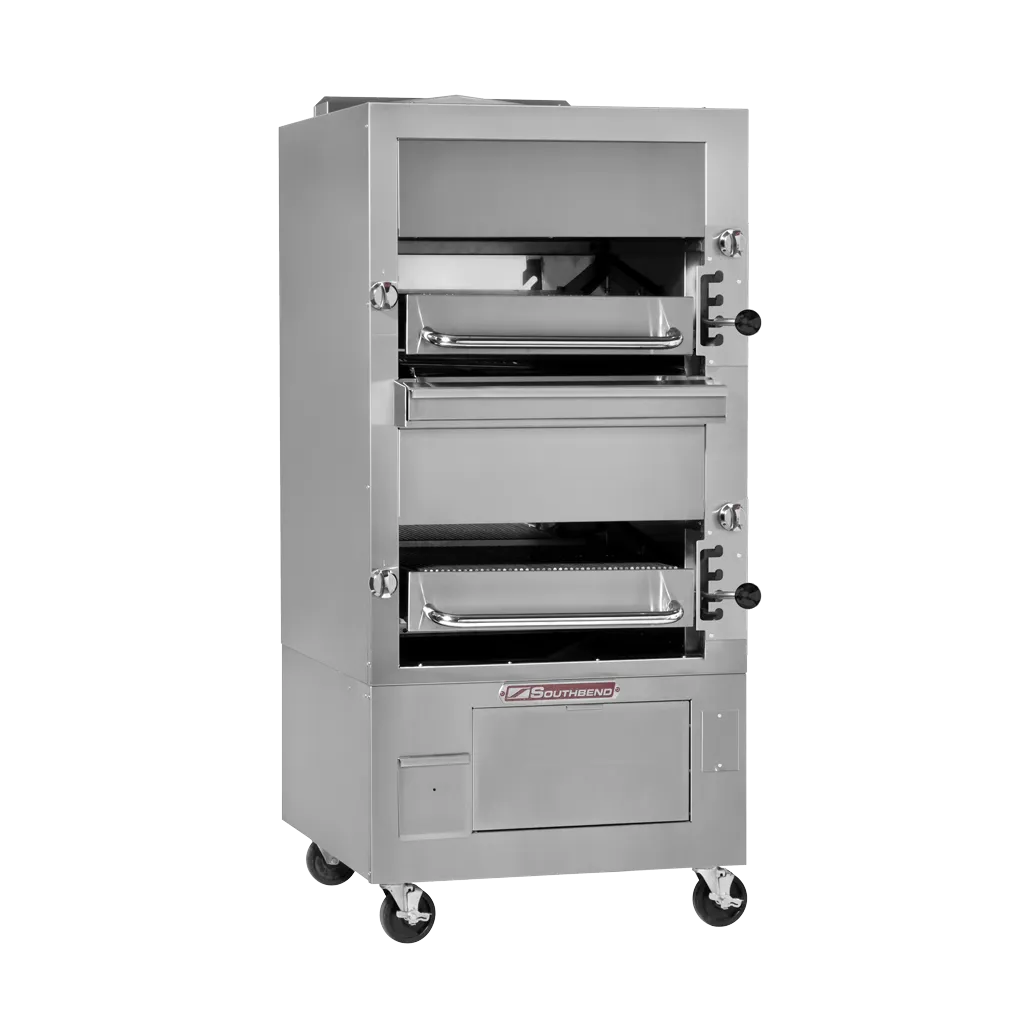 Cooking at its finest with the Southbend, 234R, Broiler, Deck-Type, Gas. This radiant broiler is designed to deliver exceptional performance in a commercial restaurant setting. With its double-deck design and 24-1/2" x 28" broiling grids, you can easily cook large quantities of food to perfection. The four height positions and two burner controls allow for precise heat control, ensuring that every dish is cooked just the way you want it. The aluminum back and stainless steel front, sides, and top not only make this broiler durable and easy to clean but also give it a sleek and professional appearance. The 6" adjustable legs provide stability and flexibility in any kitchen layout. With a powerful 220000 BTU output, this broiler is capable of handling high-volume cooking with ease. CSA and NSF certifications guarantee its safety and quality. Upgrade your restaurant's cooking capabilities with the Southbend, 234R, Broiler, Deck-Type, Gas.