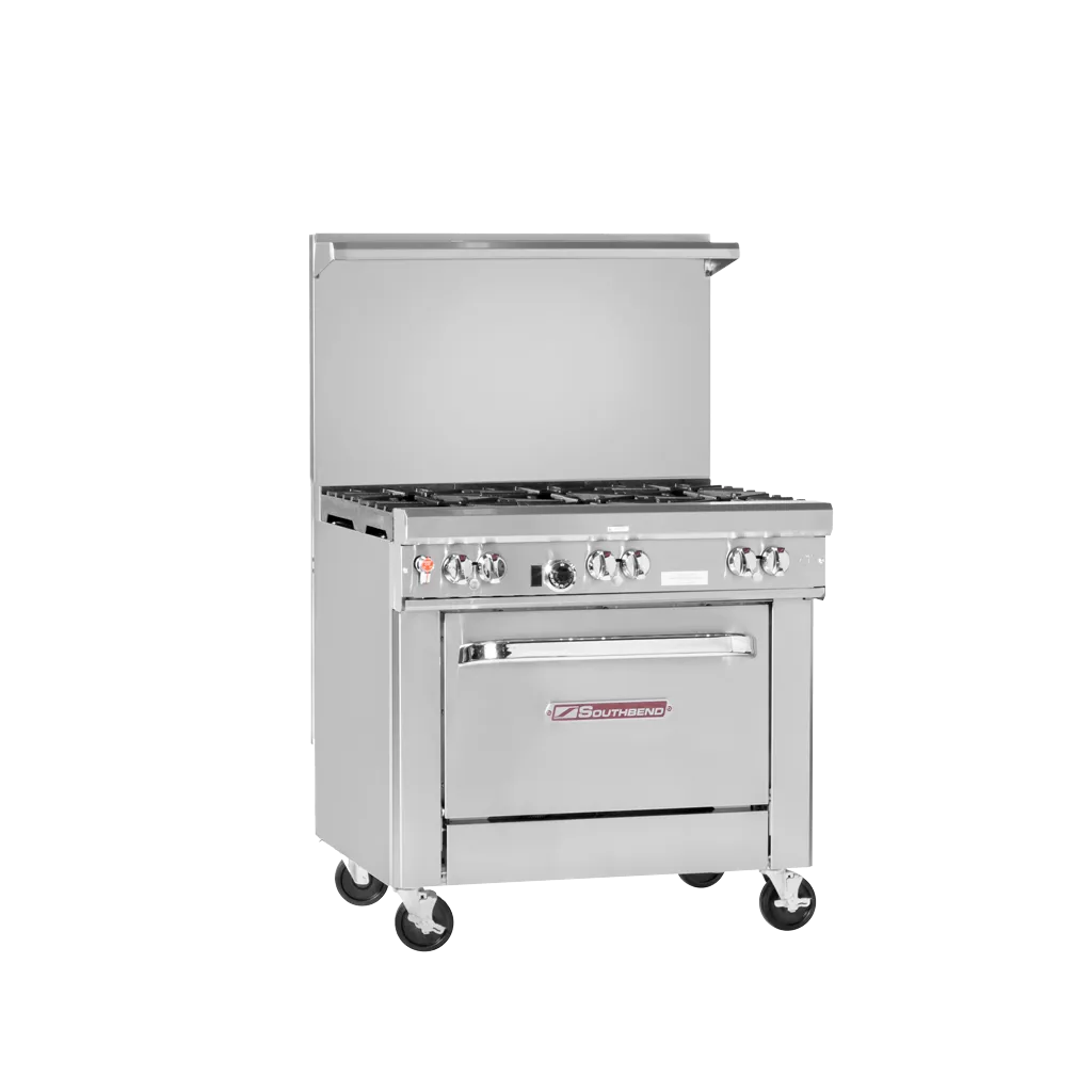 Cook with confidence and flair using the Southbend, 4364C-2CL, Range, 36" Restaurant, Gas. This ultimate restaurant range is designed to meet the demands of a busy commercial kitchen. With its powerful 130,000 BTU gas burners, including a star/sauté burner and a non-clog burner, you can easily cook a variety of dishes to perfection. The 24" charbroiler on the left side adds versatility to your menu, allowing you to grill mouthwatering steaks, burgers, and more. The stainless steel construction of the front, sides, shelf, and adjustable legs ensures durability and easy cleaning, while the cabinet base provides convenient storage for your cooking essentials. The 22-1/2" flue riser with a shelf maximizes space utilization. This Southbend range is CSA and NSF certified, guaranteeing its quality and safety. Upgrade your restaurant kitchen with the Southbend, 4364C-2CL, Range, 36" Restaurant, Gas and elevate your culinary creations to new heights.