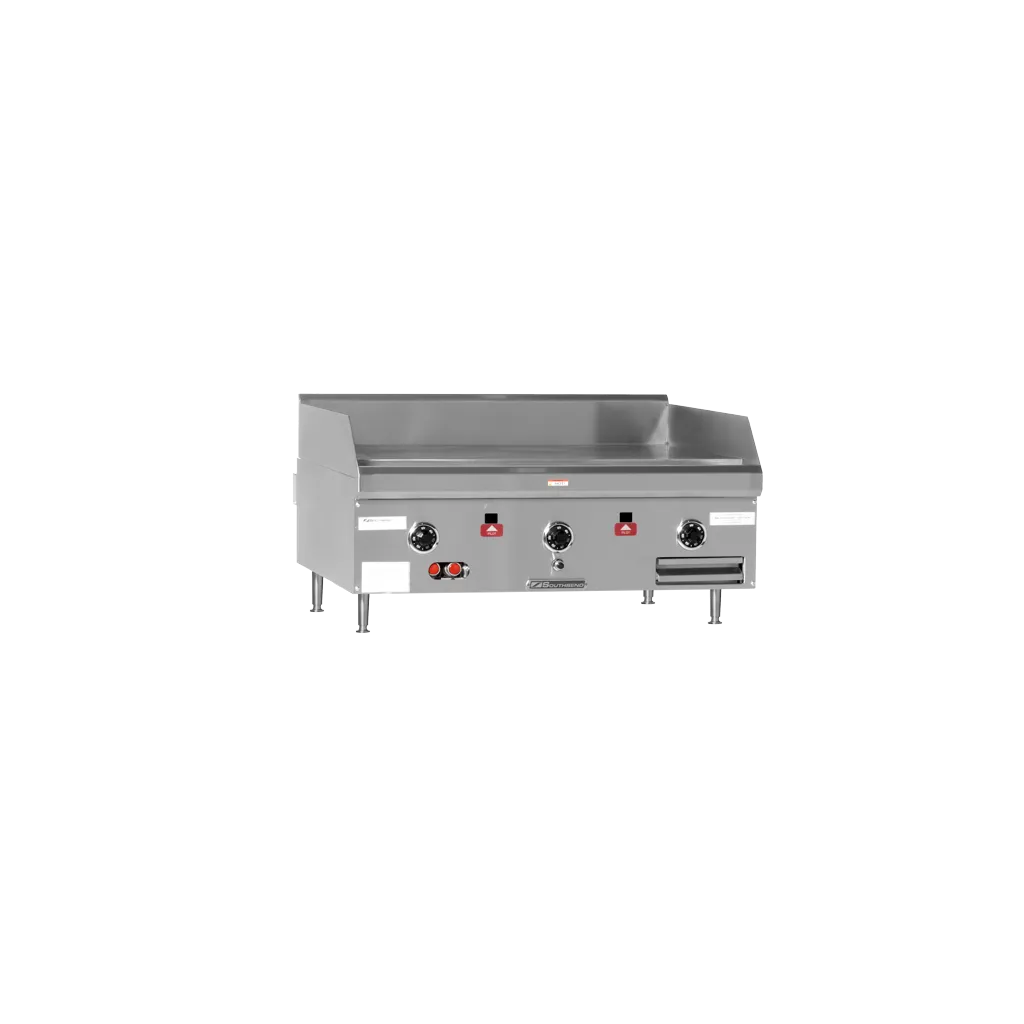 Revolutionize your cooking setup with the Southbend HDG-72-M Gas Countertop Griddle. This high-quality griddle is designed to meet the demands of a busy commercial restaurant kitchen. With a spacious 72" W x 24" D cooking surface, you'll have plenty of room to cook multiple dishes at once. The 1" thick polished steel plate ensures even heat distribution and excellent heat retention, allowing you to achieve perfect results every time. The manual controls give you precise control over the cooking temperature, while the battery spark ignition makes it easy to start up the griddle quickly. The stainless steel front, sides, and 4" adjustable legs not only provide durability but also give the griddle a sleek and professional look. With a powerful 120,000 BTU, this griddle is ready to handle any cooking task. Trust Southbend, a reputable vendor known for their top-quality products, to deliver a griddle that will enhance your restaurant's efficiency and productivity.