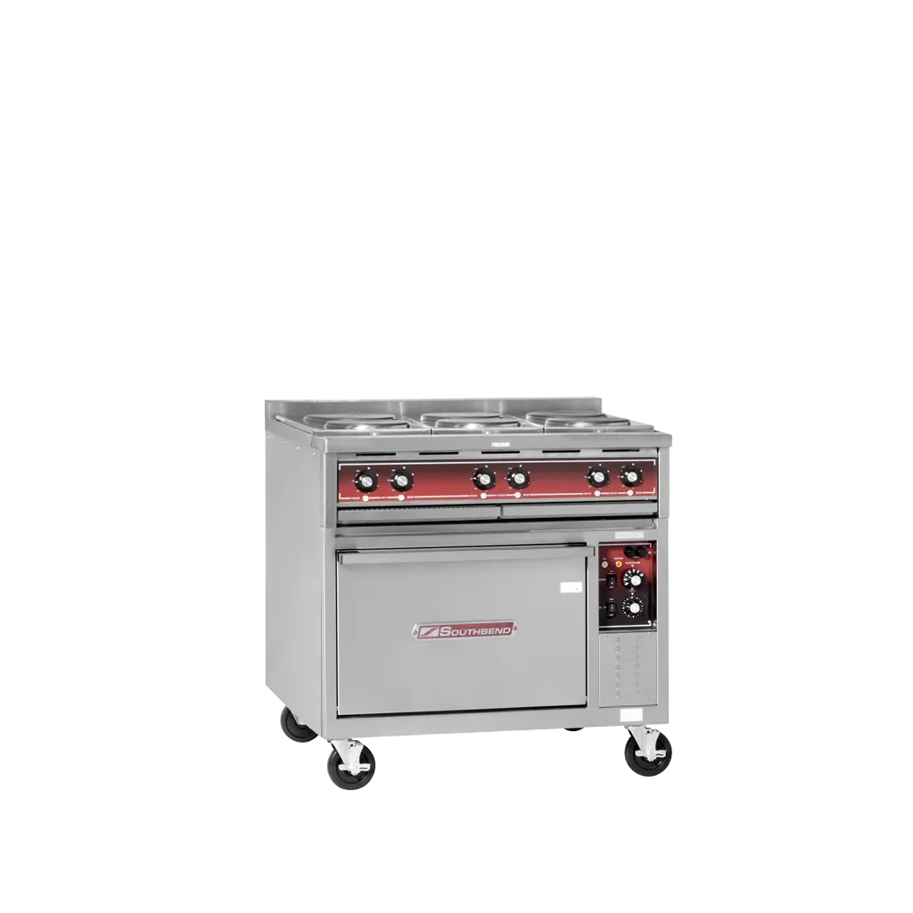 Enhance the heart of your restaurant with the Southbend SE36D-BBB Range. This heavy-duty electric range is designed to meet the demands of a busy commercial kitchen. With its 36" size, it provides ample cooking space for your culinary creations. The range features six round hotplates, each with a 3-heat switch, allowing you to easily adjust the temperature for different dishes. The standard oven, which includes one rack, is perfect for baking and roasting. Made with a stainless steel front, sides, top, and oven lining, this range is not only durable but also easy to clean. The 6" legs provide stability and make it easy to move the range for cleaning purposes. With its cETLus and ETL-Sanitation certifications, you can trust that this range meets the highest standards of safety and sanitation. Upgrade your restaurant kitchen with the Southbend SE36D-BBB Range and experience the difference in performance and reliability.