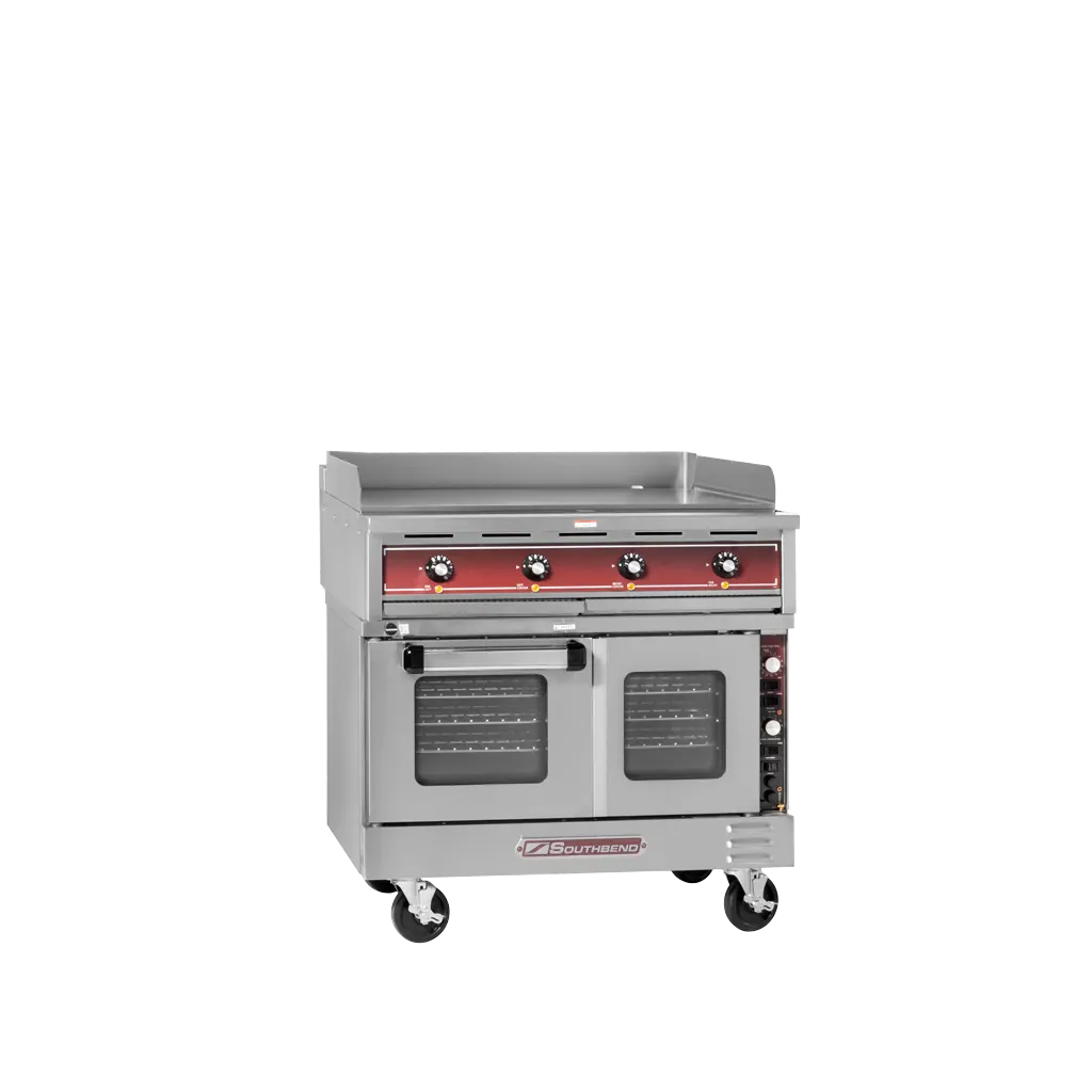 Introducing the Southbend SE36T-TTT Range, a heavy-duty electric range designed to craft culinary wonders in commercial restaurant kitchens. This 36" range features a griddle with thermostatic controls, allowing precise temperature adjustments for perfect cooking results. The range also includes a TruVection oven with three oven racks, providing ample space for baking multiple dishes simultaneously. With a stainless steel front, sides, top, and oven lining, this range not only offers durability but also adds a sleek and professional look to any kitchen. The SE36T-TTT is cETLus and ETL-Sanitation certified, ensuring it meets the highest safety and sanitation standards. As part of Southbend's Service First Program, this range comes with exceptional customer service and support. Upgrade your restaurant kitchen with the Southbend SE36T-TTT Range and experience the reliability and performance that Southbend is known for.