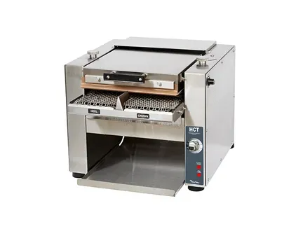 The HCTE13S contact toaster seals bread surfaces which provides a crispy texture and keeps sauces from penetrating the bun. The HCTE13M features electronic controls and a silicone belt.